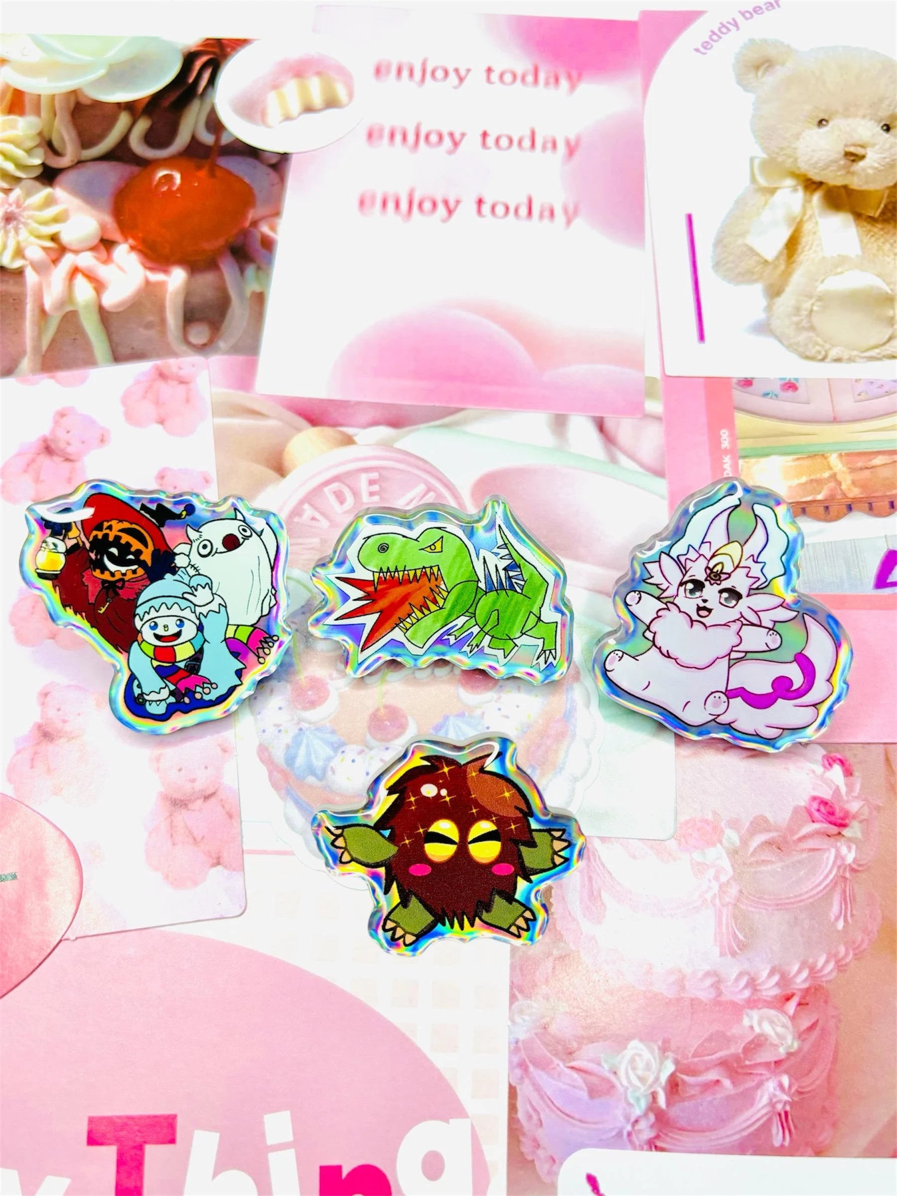 The first set of ygo inspired pins featuring Doodle Beast Tyrano, Purrely, Ghostricks & Kuriboh inspired characters. They are about 1.5 inches big. <3